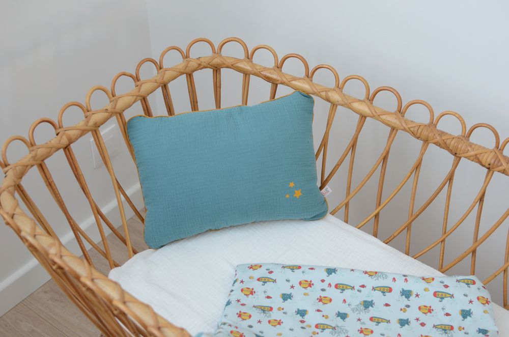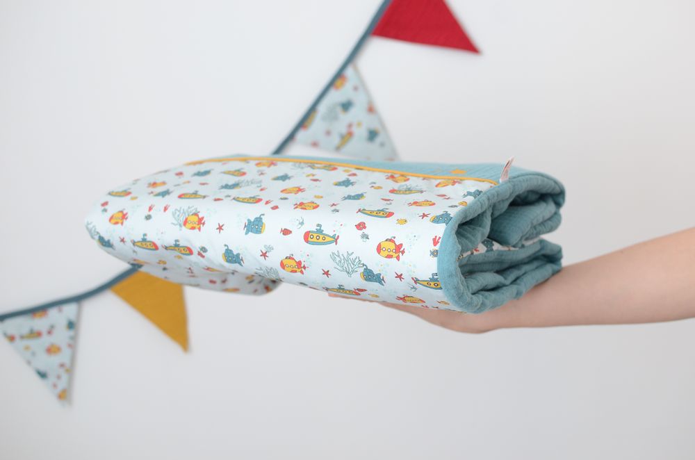 - Recto: Double gaze de coton 100% bio certifié GOTS, popeline de coton 100% bio motif exclusif Blue Madeleine certifié GOTS et passepoil contrastant