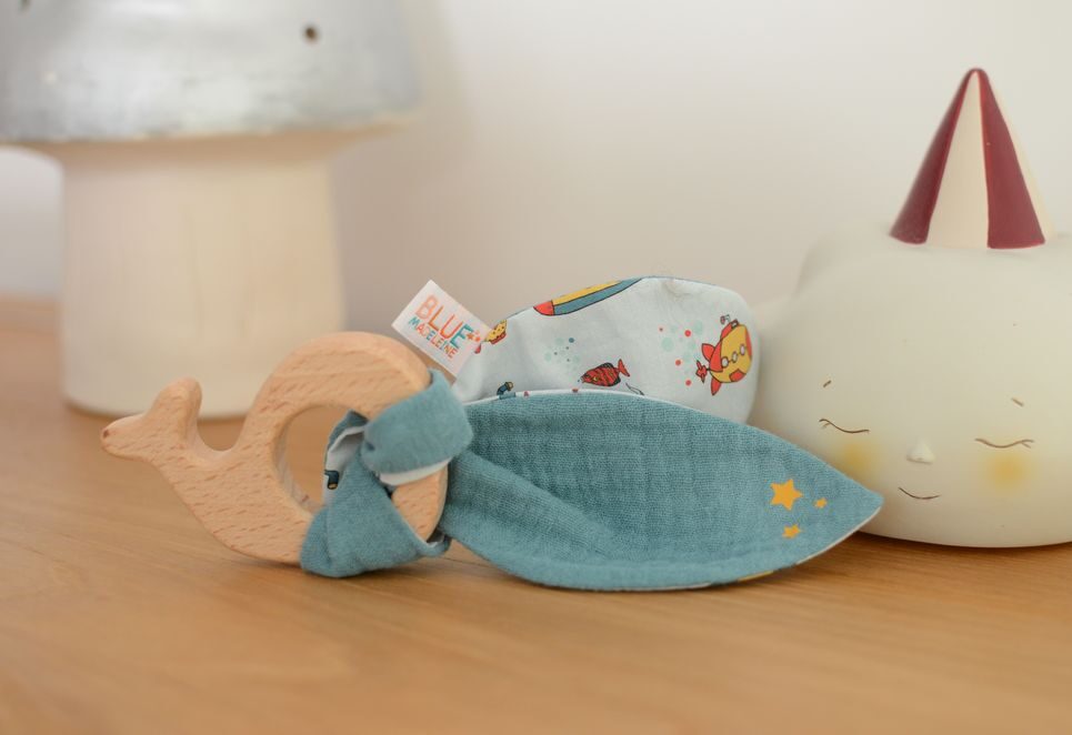 - Partie tissu formée d’un coté en double gaze de coton 100% bio certifié GOTS et d’un côté en popeline de coton 100% bio motif exclusif Blue Madeleine certifié GOTS