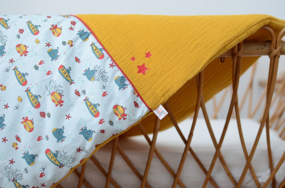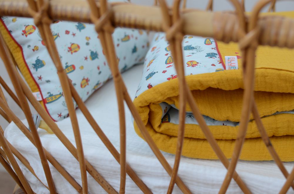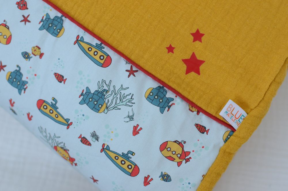 - Recto: Double gaze de coton 100% bio certifié GOTS, popeline de coton 100% bio motif exclusif Blue Madeleine certifié GOTS et passepoil contrastant