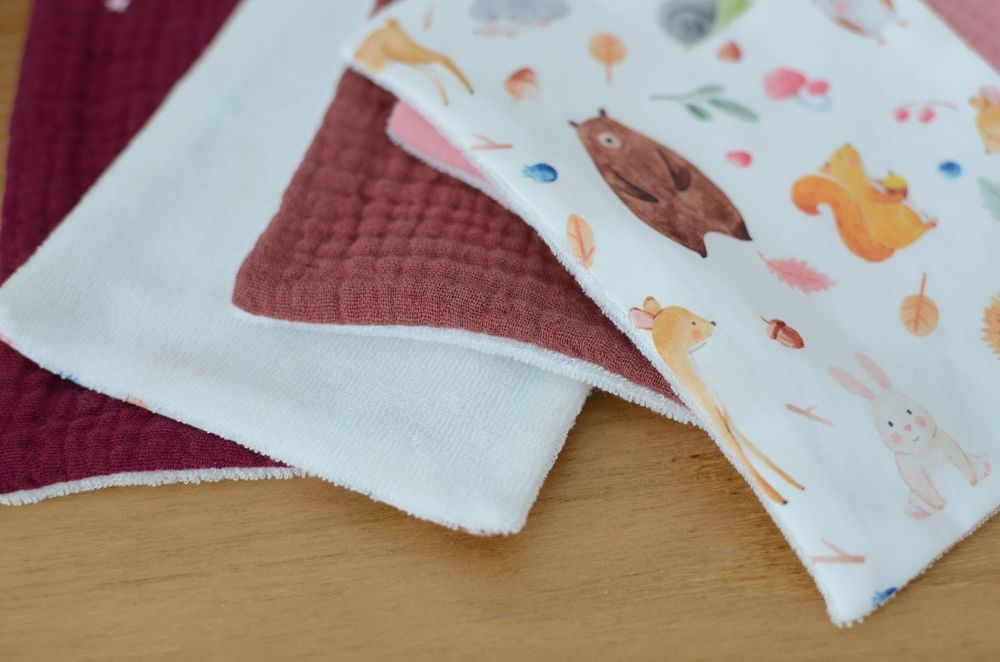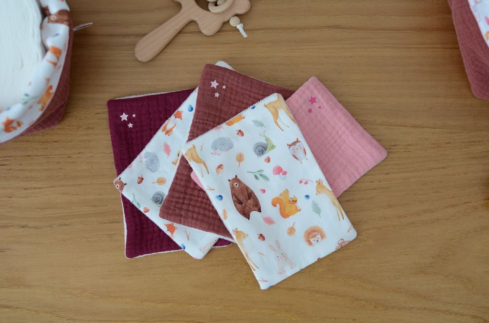- Recto: 3 lingettes en certifié double gaze de coton 100 % bio GOTS , 2 lingettes en popeline de coton coton 100 % bio certifié GOTS